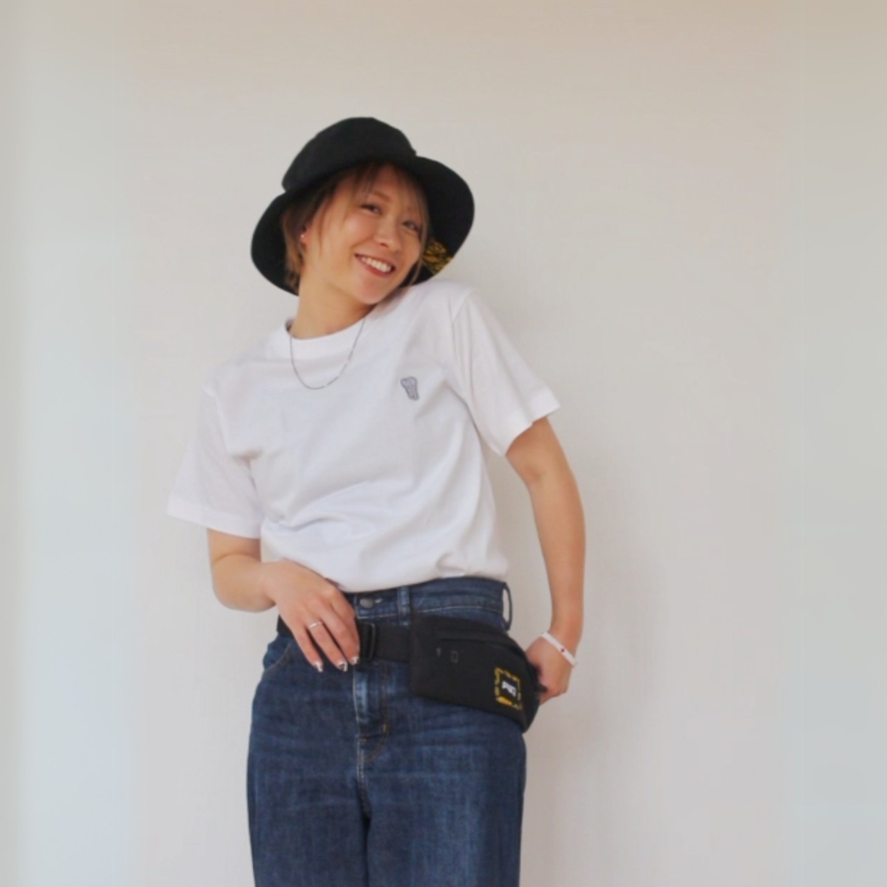 胸元のワッペンには「一歩踏み出す象」のロゴ。